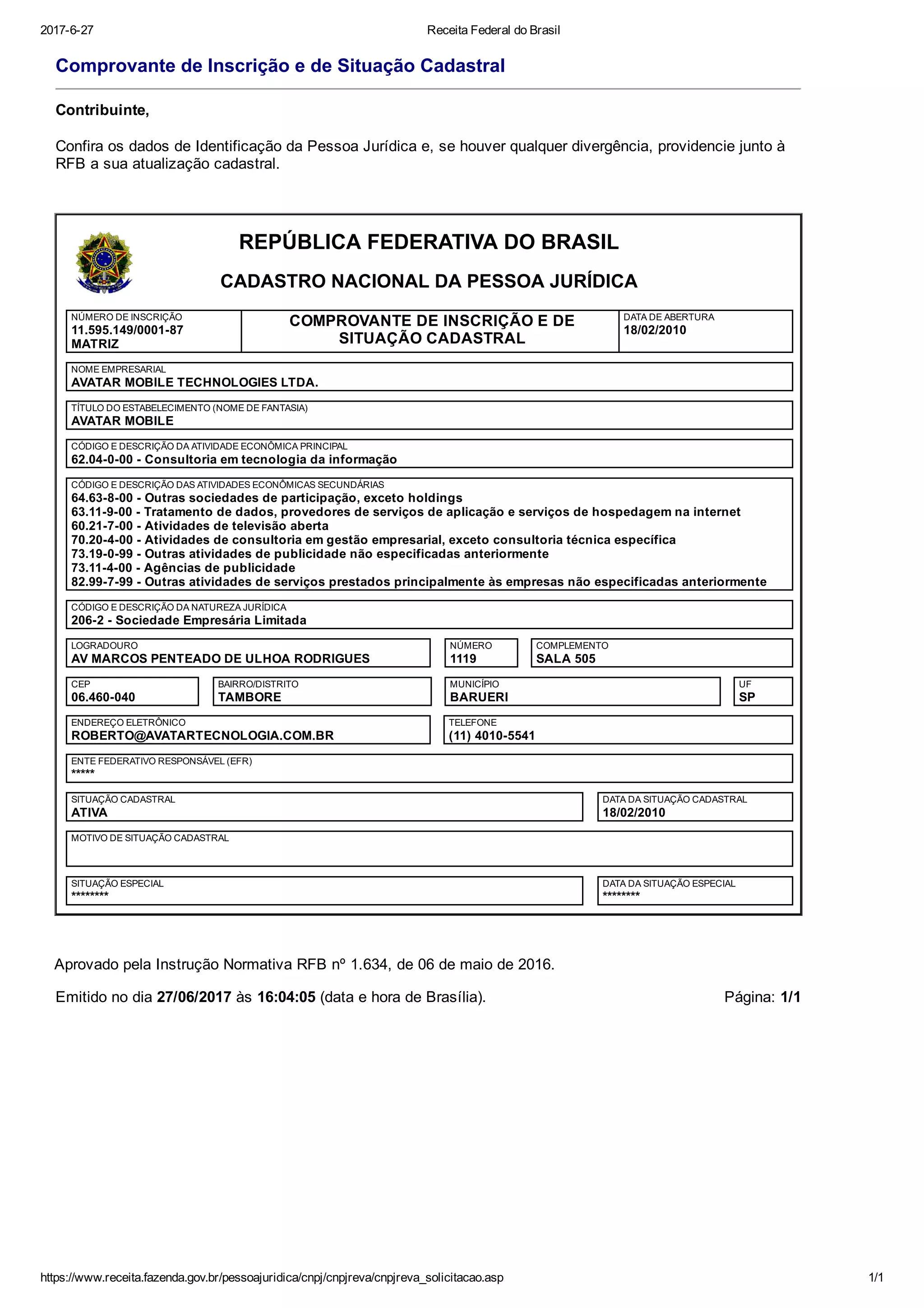 Este documento fornece informações cadastrais de uma empresa, incluindo seu nome, CNPJ, endereço, atividade principal e dados de situação cadastral.
