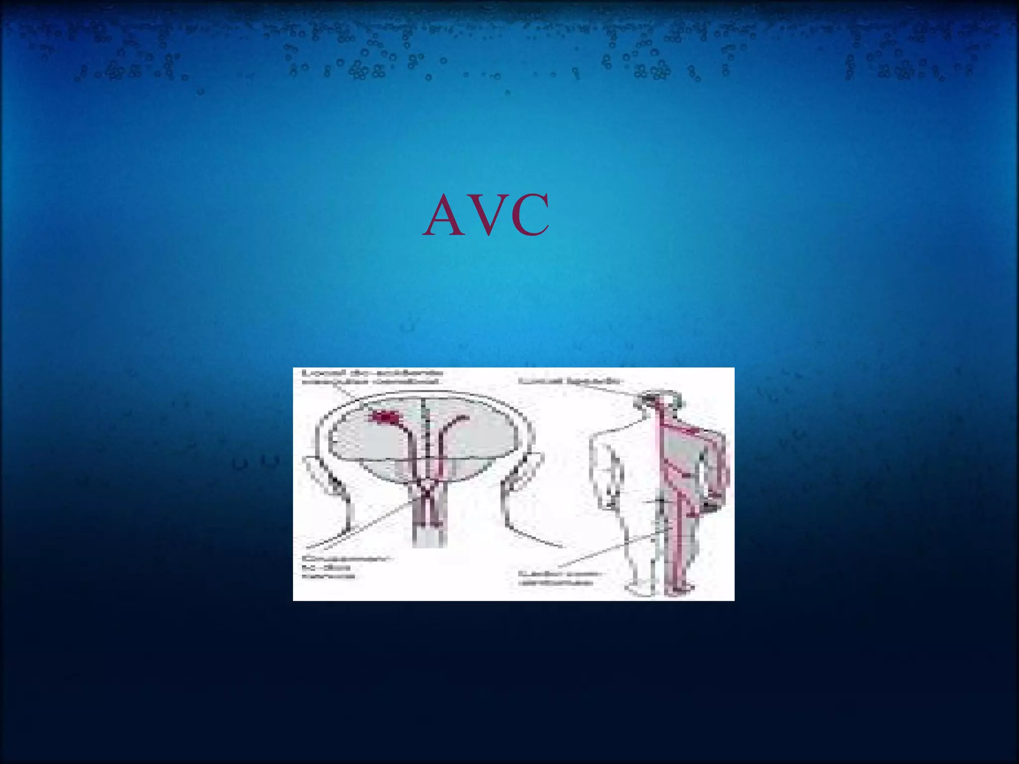O documento descreve os principais tipos de acidente vascular cerebral (AVC): infarto cerebral e hemorragia cerebral. O AVC ocorre quando o fluxo sanguíneo para o cérebro é interrompido, prejudicando o funcionamento das células cerebrais e podendo causar graves consequências. O AVC é uma das principais causas de morte e incapacidade no Brasil.