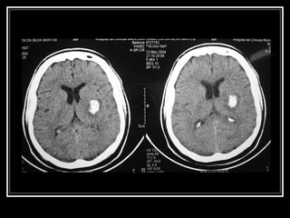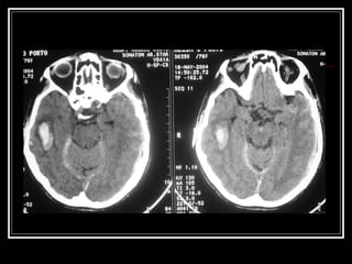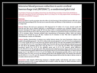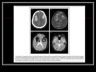 O documento resume as principais informações sobre hemorragia intracraniana espontânea, incluindo epidemiologia, fatores de risco, diagnóstico, tratamento clínico e cirúrgico. A taxa de mortalidade é alta, variando de 35-65% dependendo da localização do sangramento, com poucos sobreviventes funcionalmente independentes após 6 meses. O principal fator de risco é a hipertensão arterial sistêmica.