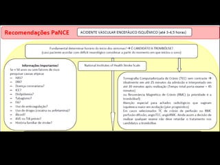 Um homem de 62 anos deu entrada na emergência com sintomas de AVE isquêmico à esquerda. Ao exame neurológico apresentava disartria, hemianopsia e hemiparesia à esquerda. Deve-se considerar a possibilidade de trombólise venosa com rt-PA se o paciente se enquadrar nos critérios, como início dos sintomas há menos de 3 horas. Além disso, é importante o controle rigoroso dos fatores de risco e a prevenção de complicações como hemorragia intracraniana.