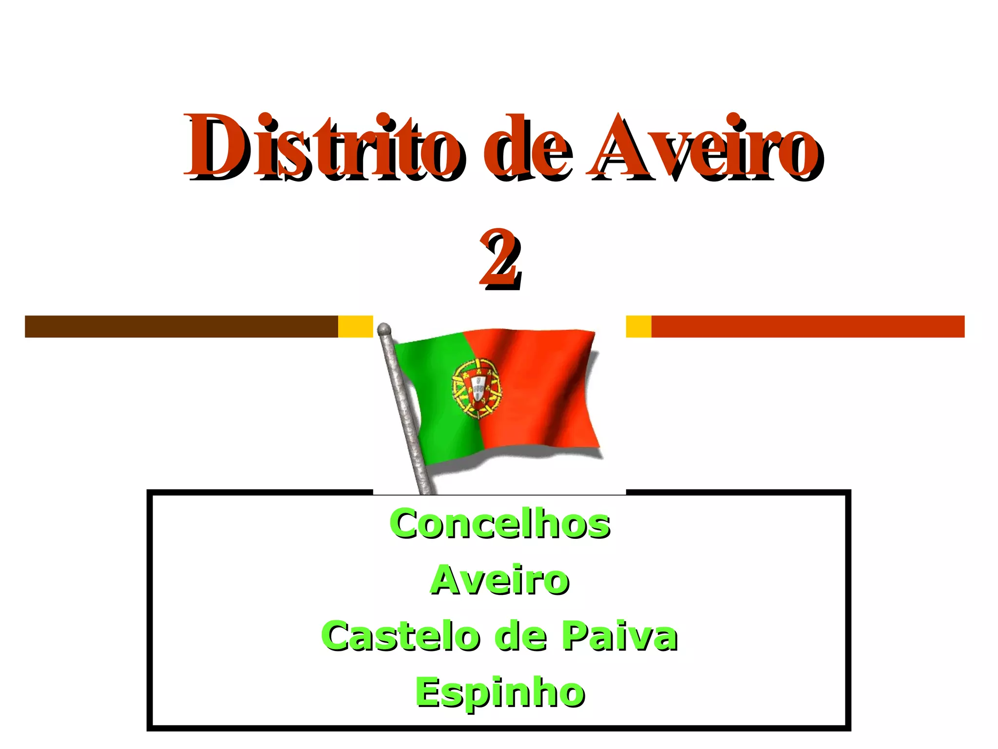 Este documento fornece um resumo de três concelhos no distrito de Aveiro: Aveiro, Castelo de Paiva e Espinho. Aveiro teve origem como uma cidade fundada pelos romanos e foi um importante centro urbano na pré-história. Atualmente é uma cidade progressiva baseada na indústria e educação. Castelo de Paiva tem uma economia baseada na agricultura, madeira e mineração. Espinho desenvolveu-se após a chegada do caminho de ferro e é conhecida como estação balnear e pela sua