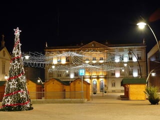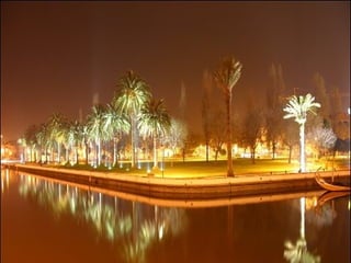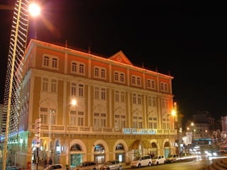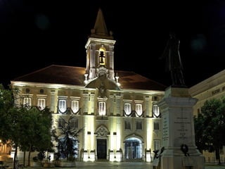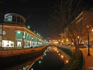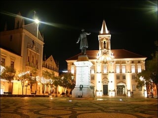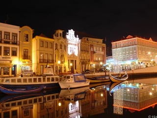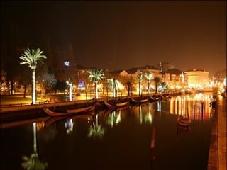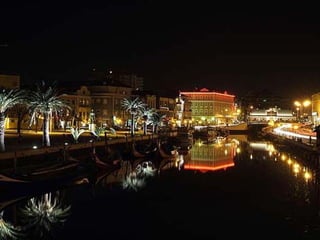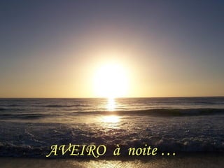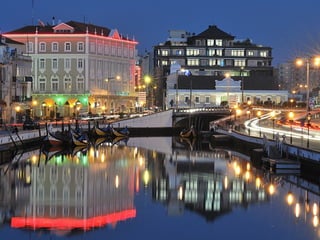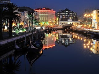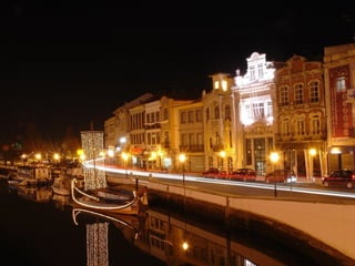 A cidade de Aveiro à noite é descrita como tranquila e pacífica, com poucas pessoas nas ruas iluminadas, e a luz dos postes refletindo na água que circula pelos canais da cidade.