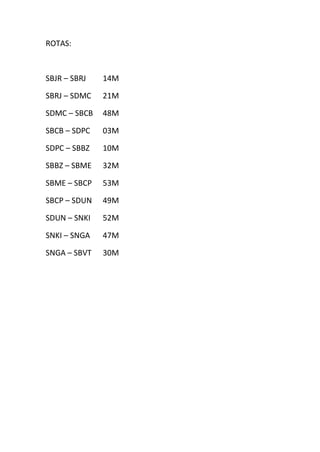 O documento descreve uma microaventura de 11 pernas em 359 milhas navegando em um BK3 entre aeroportos pequenos no Brasil, recomendando voar sem piloto automático e manter o controle manual do avião a uma altitude de 4000 pés. A rota inclui trechos entre 12 aeroportos regionais com as distâncias entre cada um.