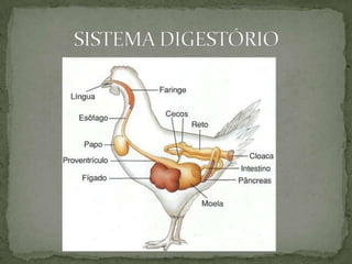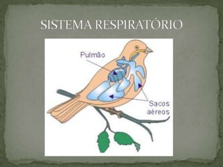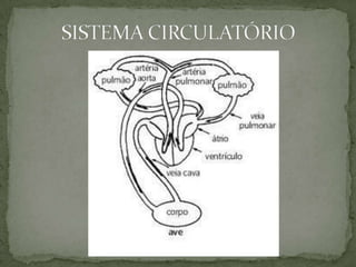 O documento descreve as principais características físicas e biológicas das aves, incluindo seu corpo aerodinâmico, penas isolantes, ossos leves que facilitam o voo, reprodução ovípara e fecundação interna, além de possuírem visão e audição aguçadas.