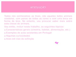O documento fornece informações gerais sobre as aves, incluindo suas características, hábitos alimentares, sistemas digestivo, respiratório e reprodutivo. Também lista exemplos de aves em Portugal e espécies em vias de extinção.