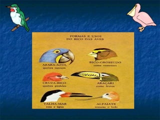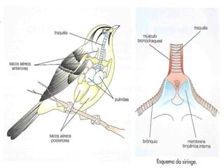 O documento descreve as principais adaptações das aves para o voo, incluindo corpo aerodinâmico, penas, ossos ocos e sacos aéreos. Também aborda aspectos do sistema respiratório, circulatório e reprodutivo das aves, além de comparar estruturas de ovos de galinha e codorna.