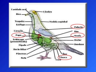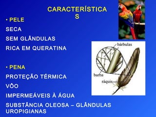 As aves possuem pele seca e sem glândulas, coberta por penas protetoras e impermeáveis. São animais de sangue quente com temperatura corporal de 40°C e sentidos bem desenvolvidos. Seu esqueleto leve e ossos pneumáticos, junto com as asas, permitem o voo, importante para a locomoção, alimentação e reprodução.