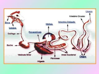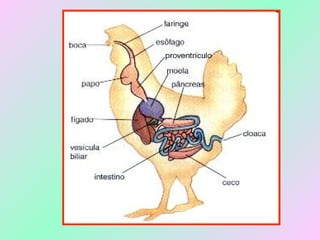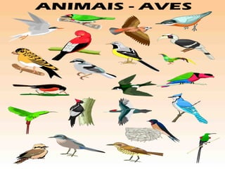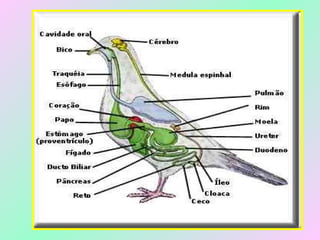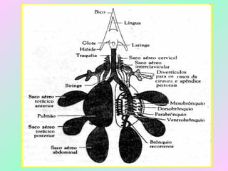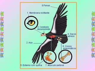 O documento fornece informações sobre as características anatômicas e fisiológicas das aves, incluindo detalhes sobre sua respiração, digestão, reprodução e evolução. Aborda os sistemas esquelético, circulatório, nervoso e respiratório das aves, além de trazer detalhes sobre as ordens de aves e sua importância para o meio ambiente e para os seres humanos.