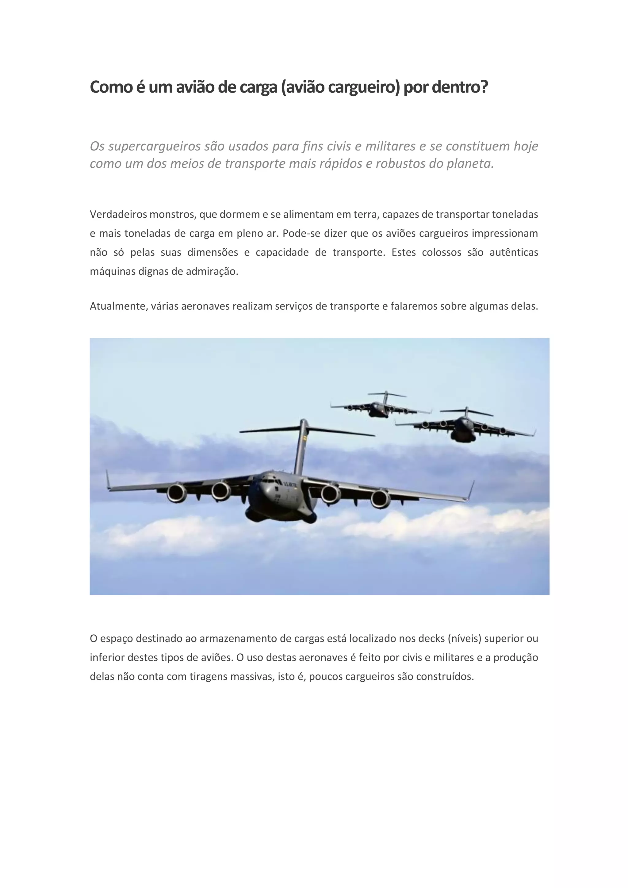 O documento descreve alguns dos maiores aviões cargueiros do mundo, incluindo o Antonov An-225, o maior avião do mundo capaz de transportar até 253 toneladas; o Airbus Beluga que transporta peças de avião; e o Boeing C-17 Globemaster III usado para transporte militar de carga e tropas.