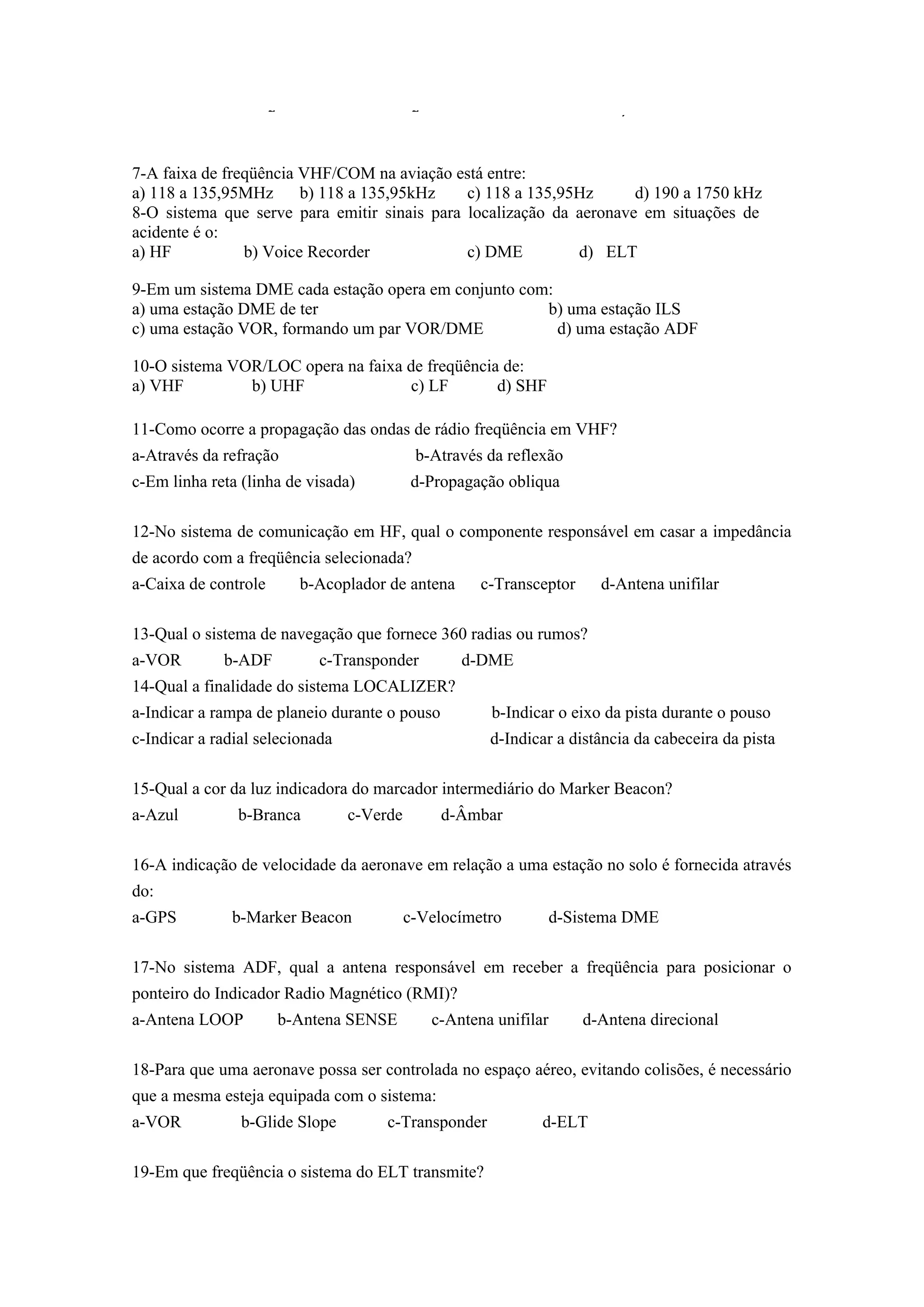 O documento apresenta 25 questões sobre sistemas de comunicação e navegação aeronáutica, como ADF, VOR, ILS, DME, rádio altímetro e ELT. As questões abordam tópicos como faixas de frequência utilizadas, componentes dos sistemas, indicações fornecidas e processos de propagação de ondas de rádio.