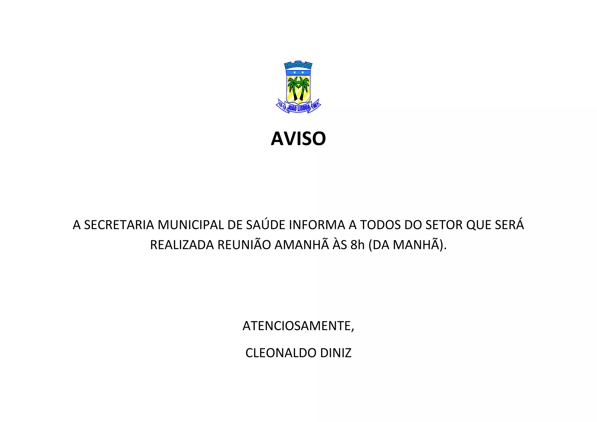 A Secretaria Municipal de Saúde convoca uma reunião amanhã às 8h da manhã para o setor de saúde. A reunião será realizada na Secretaria Municipal de Saúde.
