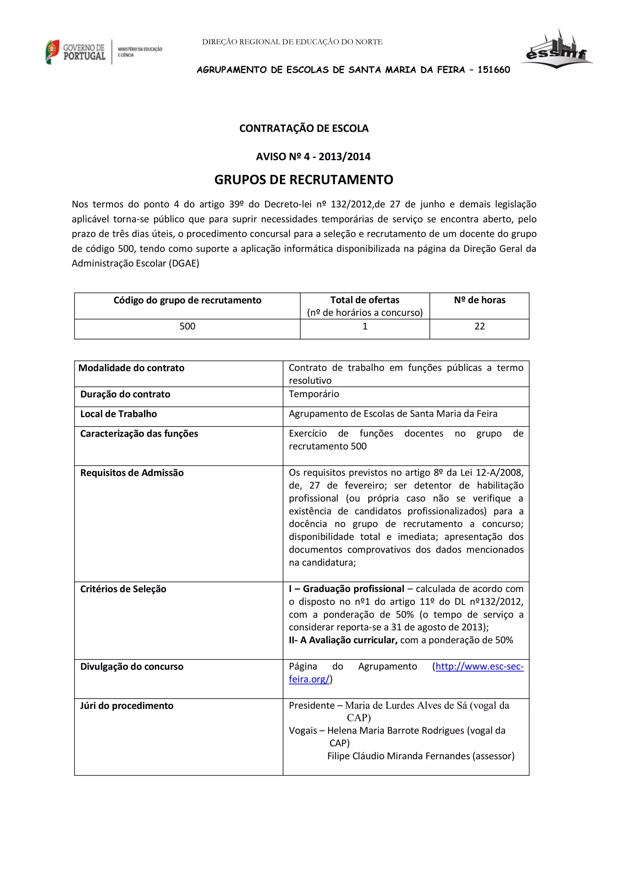 Este documento descreve (1) um aviso de concurso para contratação de um professor do grupo 500 com 22 horas de trabalho; (2) os requisitos de admissão e critérios de seleção como graduação profissional e avaliação curricular; (3) o local de trabalho será no Agrupamento de Escolas de Santa Maria da Feira.