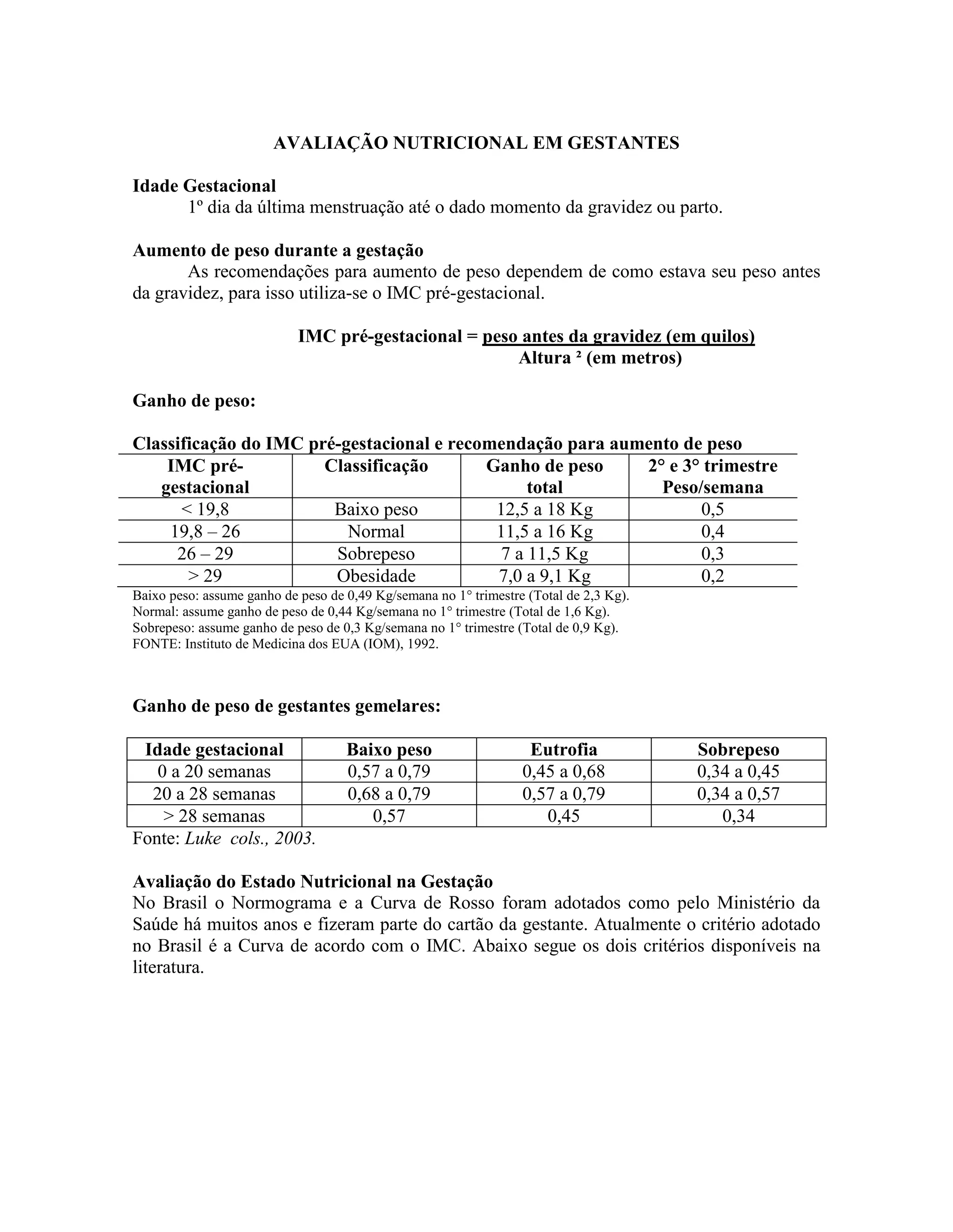 da gravidez, para isso utiliza-se o IMC pré-gestacional.