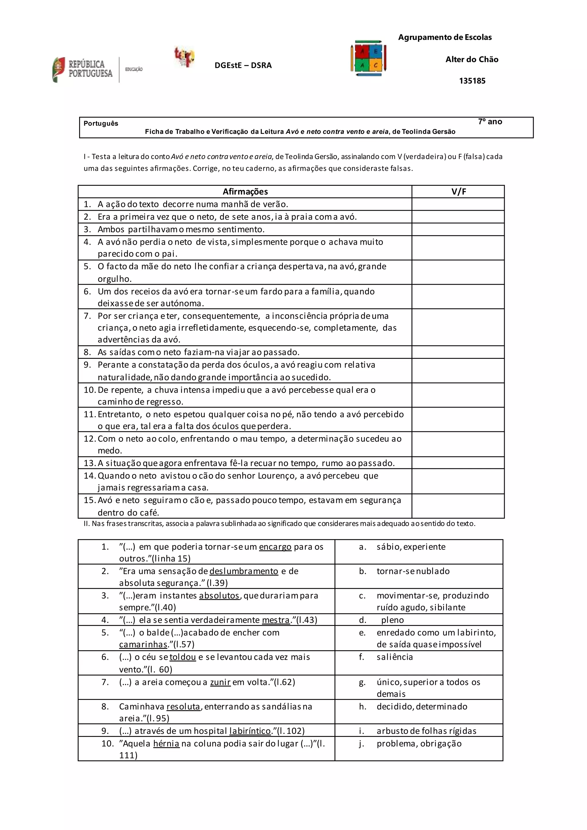 1) O documento apresenta uma ficha de trabalho sobre o conto "Avó e neto contra vento e areia", de Teolinda Gersão, com afirmações sobre o enredo para serem assinaladas como verdadeiras ou falsas, assim como palavras sublinhadas no texto para serem associadas a significados. 2) A segunda parte pede ao aluno para imaginar um desfecho alternativo para o final da história, escrevendo entre 100 a 200 palavras de forma coerente e revendo o texto. 3) A ficha de trabalho visa avaliar a compreensão do aluno