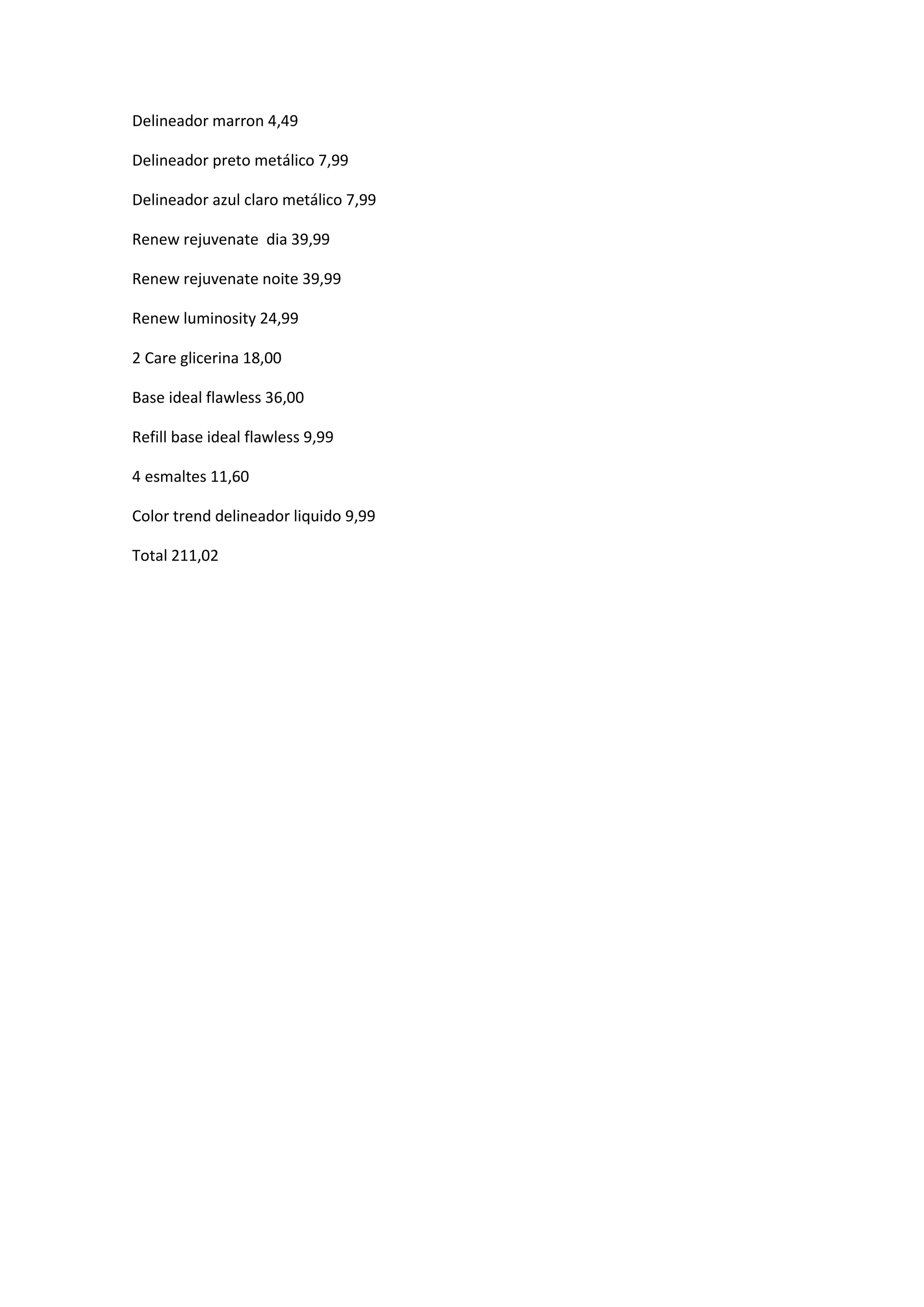 O documento lista itens de maquiagem e seus preços individuais, totalizando R$211,02. Inclui delineadores, produtos da linha Renew, base, esmaltes e outros itens de maquiagem.