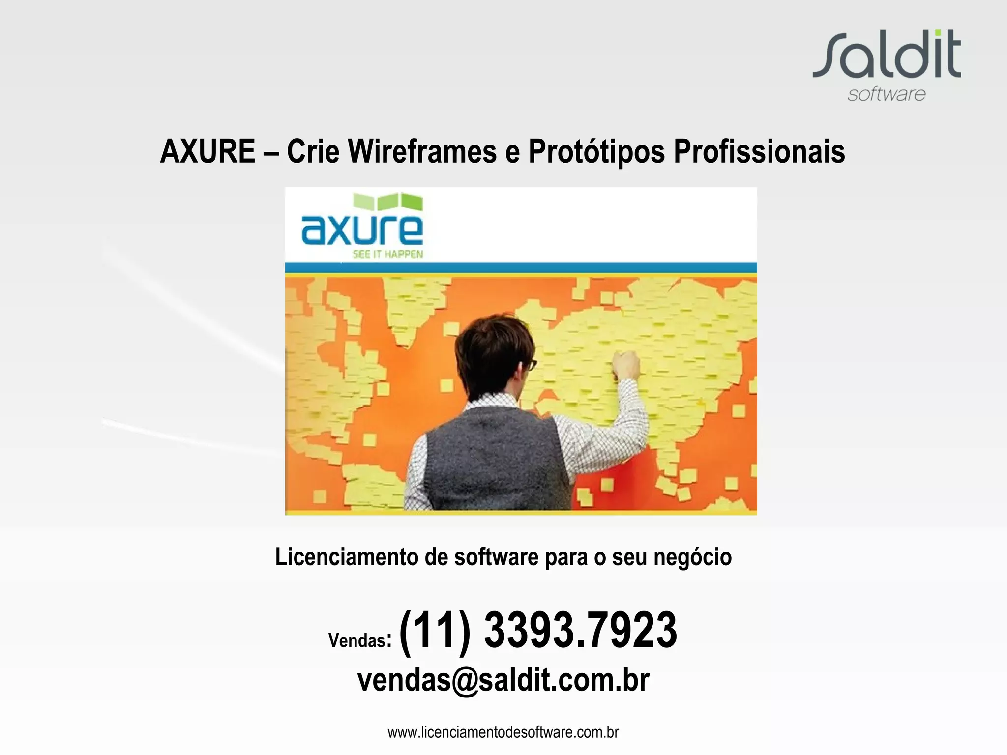 O documento descreve o software Axure RP, que permite a criação de wireframes, protótipos e especificações detalhadas para aplicativos e sites web de forma rápida e colaborativa. O Axure RP oferece recursos como widgets prontos, bibliotecas personalizáveis, modelos reutilizáveis, anotações, compartilhamento de protótipos interativos e geração automática de especificações técnicas.