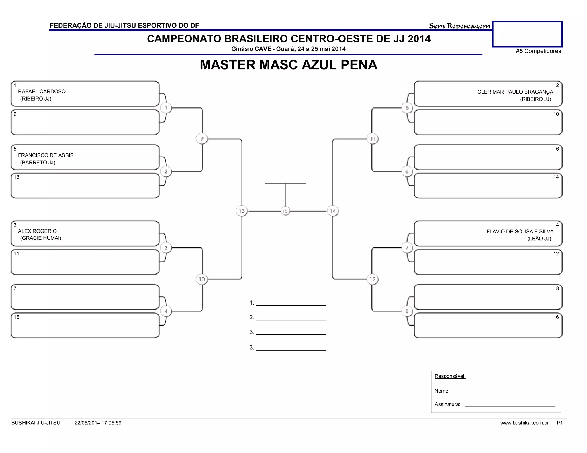 O documento descreve o campeonato brasileiro centro-oeste de jiu-jitsu de 2014, realizado nos dias 24 e 25 de maio no ginásio CAVE em Guará. Ele lista os competidores da categoria master masculino azul pena, sendo eles Rafael Cardoso em 1o lugar, Clerimar Paulo Bragança em 2o e Francisco de Assis em 3o.
