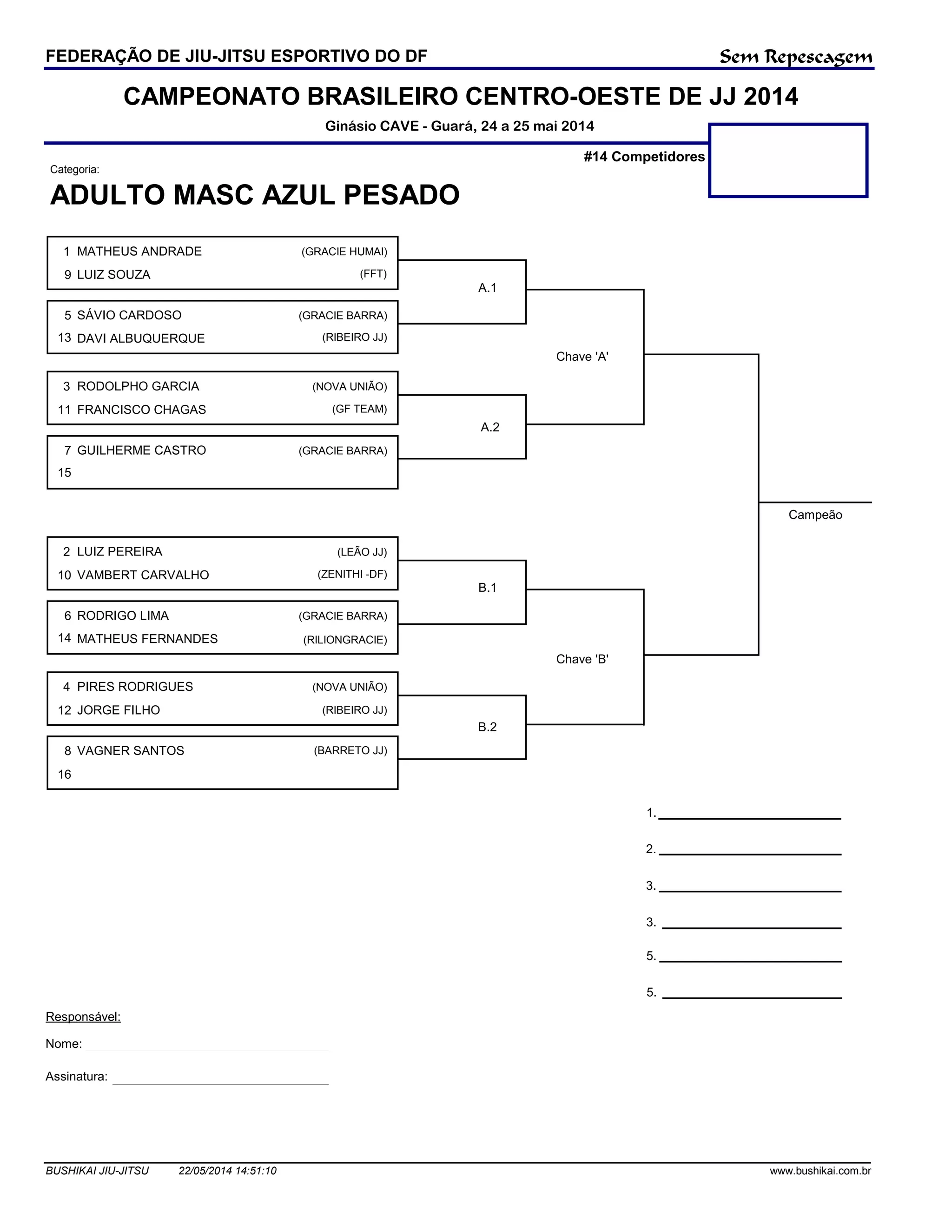O documento resume os resultados do Campeonato Brasileiro Centro-Oeste de Jiu-Jitsu 2014 na categoria adulto masculino azul pesado. O campeão foi Sávio Cardoso da Gracie Barra e o vice foi Davi Albuquerque do Ribeiro JJ. O evento teve 14 competidores sem repescagem e os competidores foram divididos em duas chaves "A" e "B".