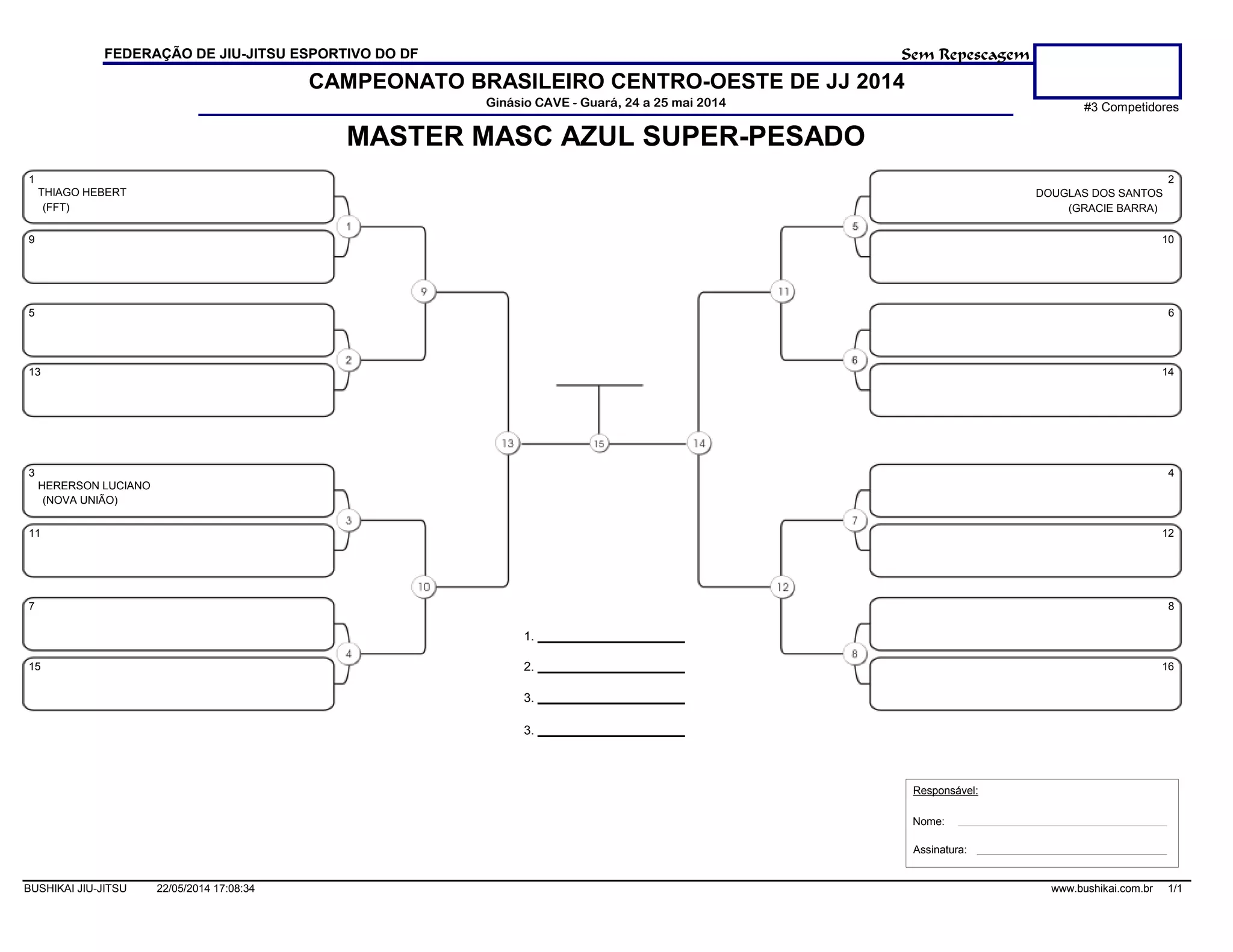 O documento descreve os resultados de um campeonato brasileiro de jiu-jitsu centro-oeste para faixa azul super-pesado, realizado em Guará nos dias 24 e 25 de maio de 2014, onde Thiago Hebert da FFT ficou em primeiro lugar, Douglas dos Santos da Gracie Barra em segundo, e Hererson Luciano da Nova União em terceiro.