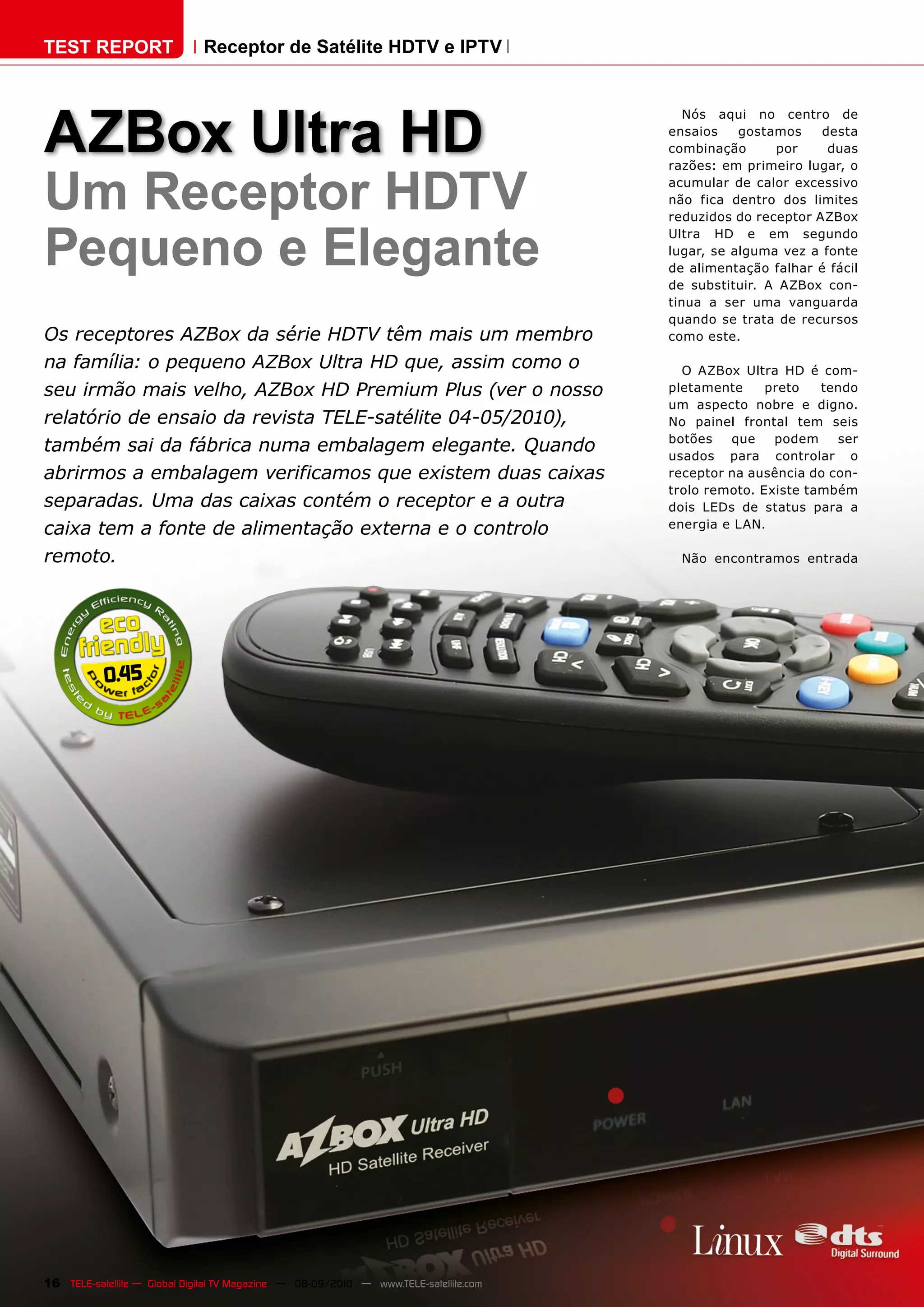 1) O AZBox Ultra HD é um pequeno e elegante receptor HDTV equipado com entrada DVB-S2 e saída HDMI, ideal para recepção de conteúdo em alta definição.