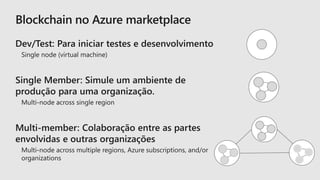 O documento discute os desafios e soluções relacionadas à adoção de blockchain, especificamente no contexto do Azure, ressaltando a complexidade do desenvolvimento de dapps e a necessidade de integrar com infraestruturas existentes. Ele descreve como ferramentas como Azure Active Directory, Logic Apps e Event Grid podem simplificar o processo de implementação e gerenciamento de soluções baseadas em blockchain. Além disso, aborda a importância da segurança, do armazenamento off-chain e da gestão de chaves na construção de aplicativos eficientes.