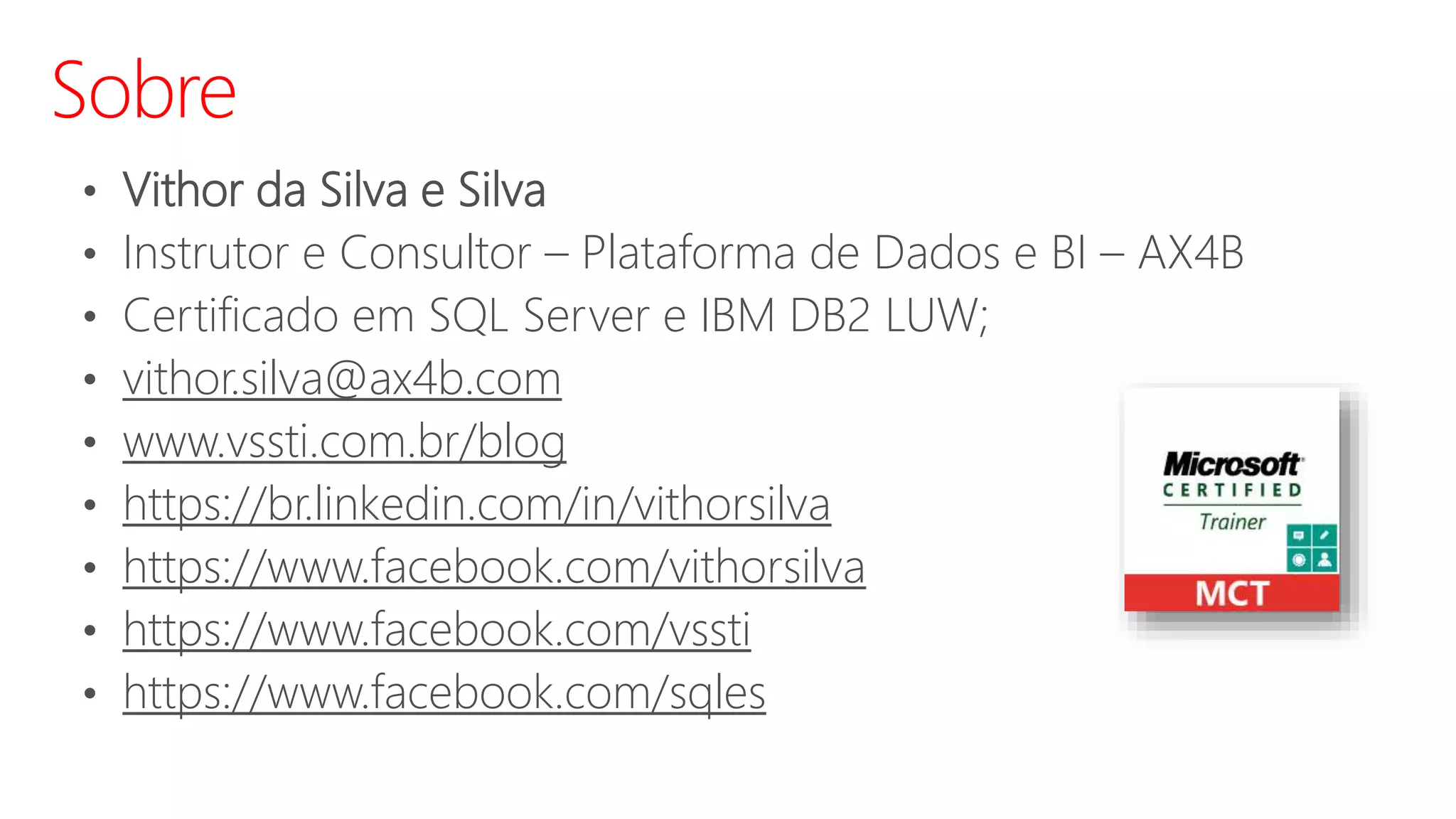 O documento apresenta as credenciais e contatos de Vithor da Silva e Silva, um instrutor e consultor em plataformas de dados e BI. Ele fornece serviços de consultoria sobre SQL Server e DB2 em máquinas físicas, virtuais locais e na nuvem pública do Azure.