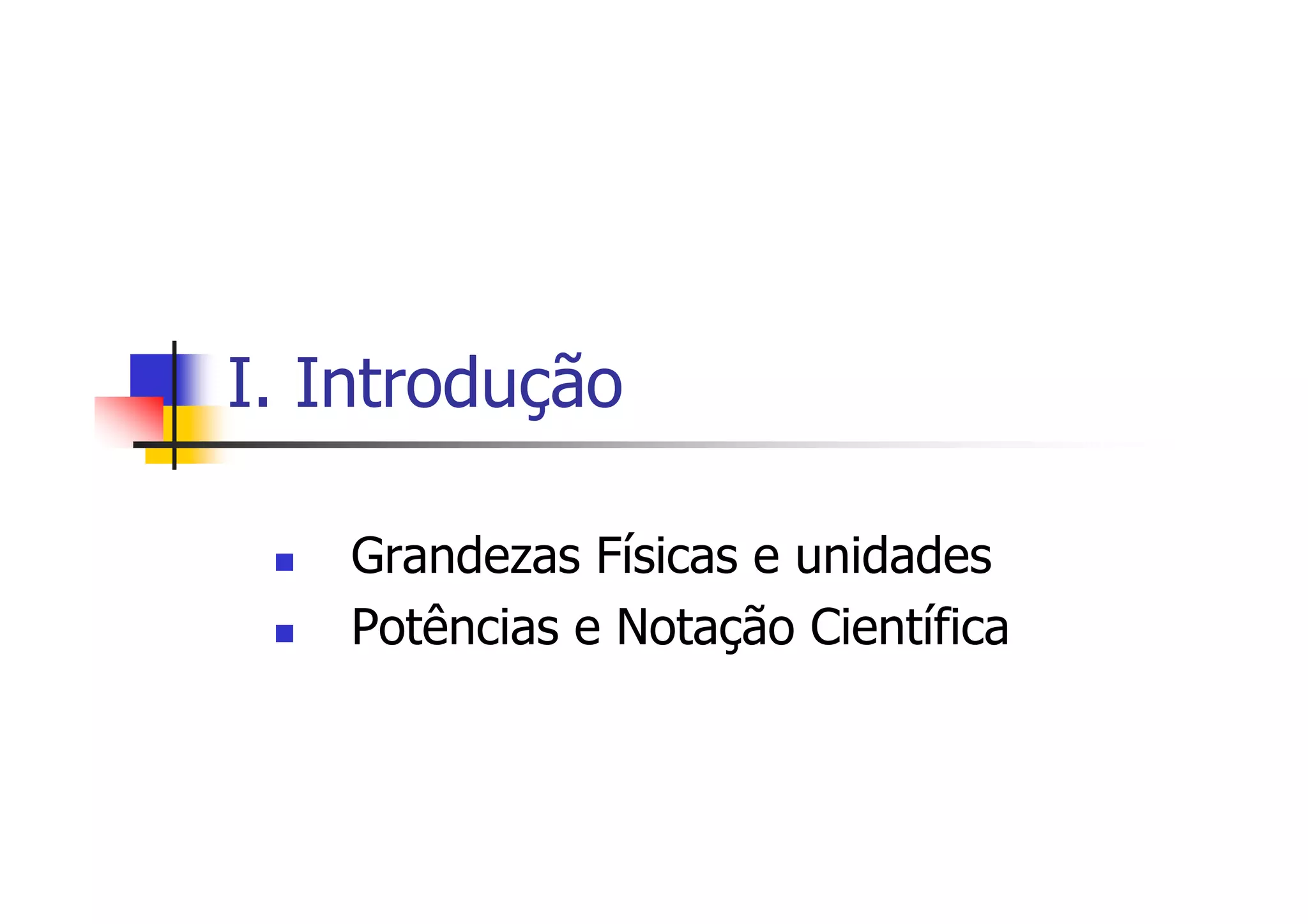 O documento discute grandezas físicas e unidades de medida, introduzindo potências e notação científica. É explicado que grandezas físicas podem ser medidas e comparadas a padrões, enquanto unidades são os padrões usados nessas medições. A notação científica representa números de forma compacta através de um coeficiente e um expoente de potência de 10. O documento também apresenta prefixos usados com unidades para indicar múltiplos e submúltiplos dessas unidades.