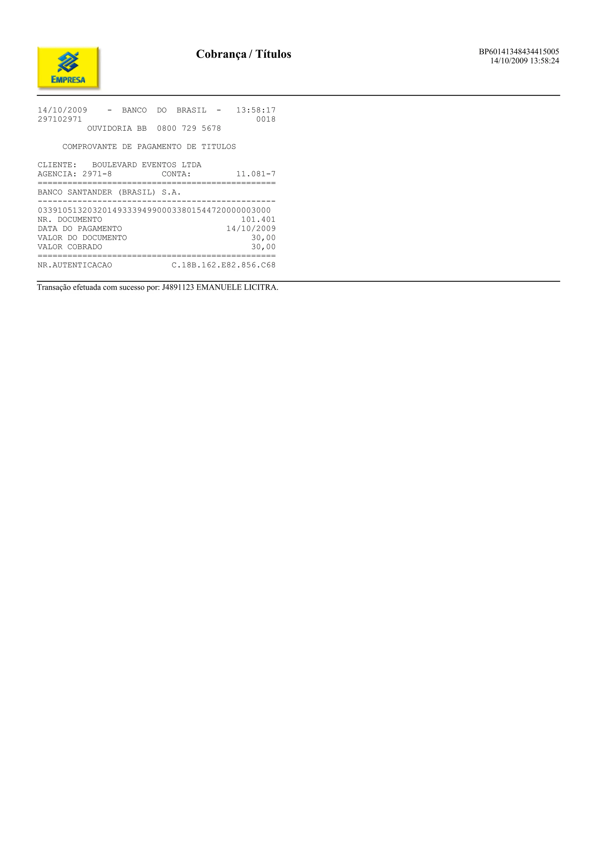 O documento é um comprovante de pagamento de título emitido pelo Banco do Brasil em 14 de outubro de 2009. Ele mostra que a Boulevard Eventos Ltda pagou um documento no valor de R$30,00 emitido pelo Banco Santander no dia do pagamento.