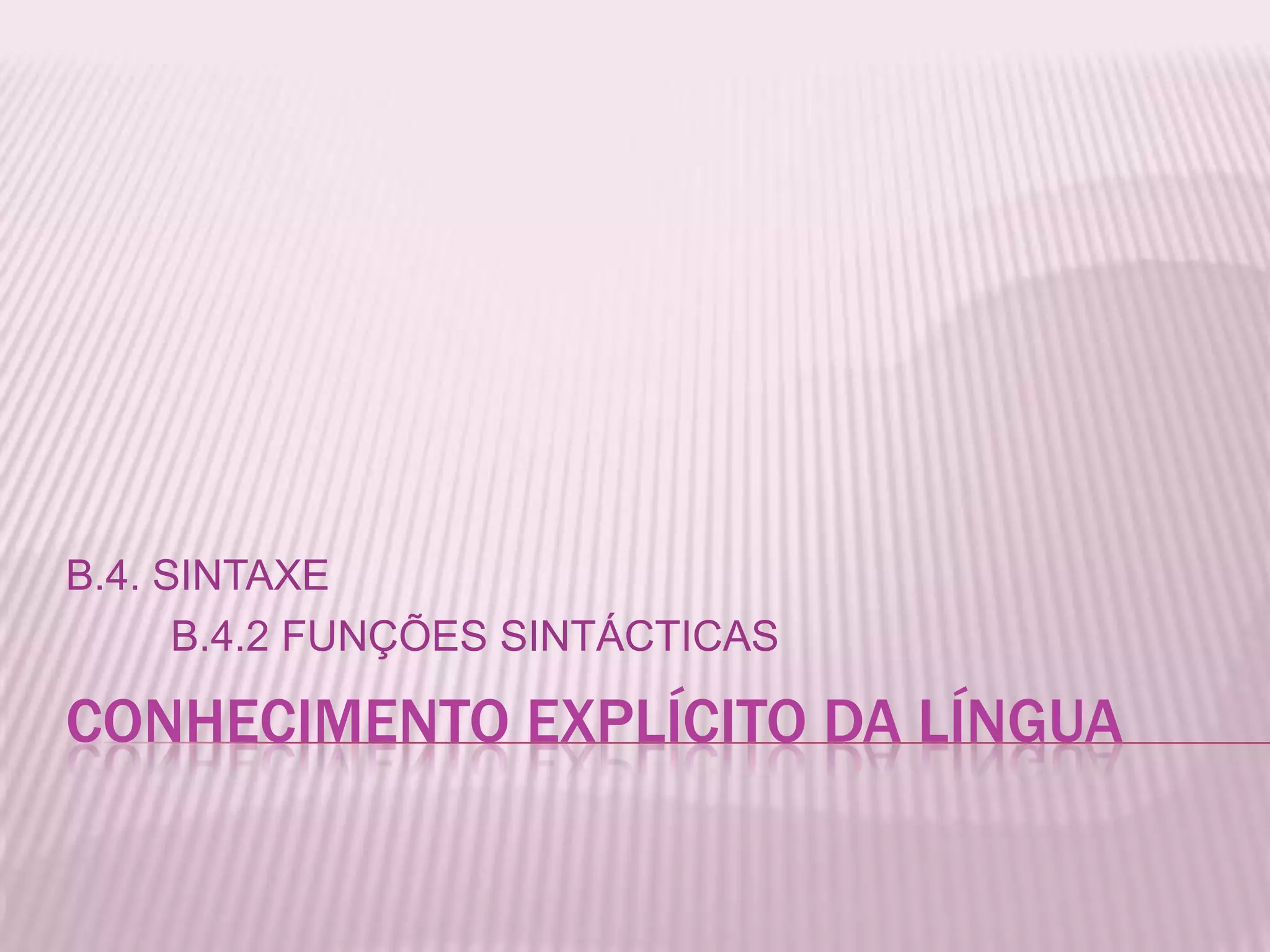 O documento discute as funções sintáticas ao nível da frase e internas ao grupo verbal. Apresenta os tipos de sujeito, vocativo, predicado e modificador da frase. Detalha as funções internas ao grupo verbal, incluindo complemento direto, indireto, oblíquo, predicativo do sujeito e do complemento direto.