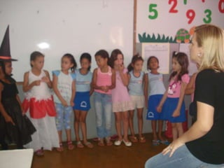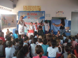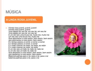 Este documento descreve um projeto realizado na Escola Municipal Professora Luzia Tavares em Paraíso do Tocantins. O projeto teve como objetivo resgatar cantigas de roda em sala de aula através do canto e da dramatização da música "A Linda Rosa Juvenil" e da criação de figurinos para a apresentação. Os alunos ensaiaram a música e apresentaram o projeto para toda a escola.