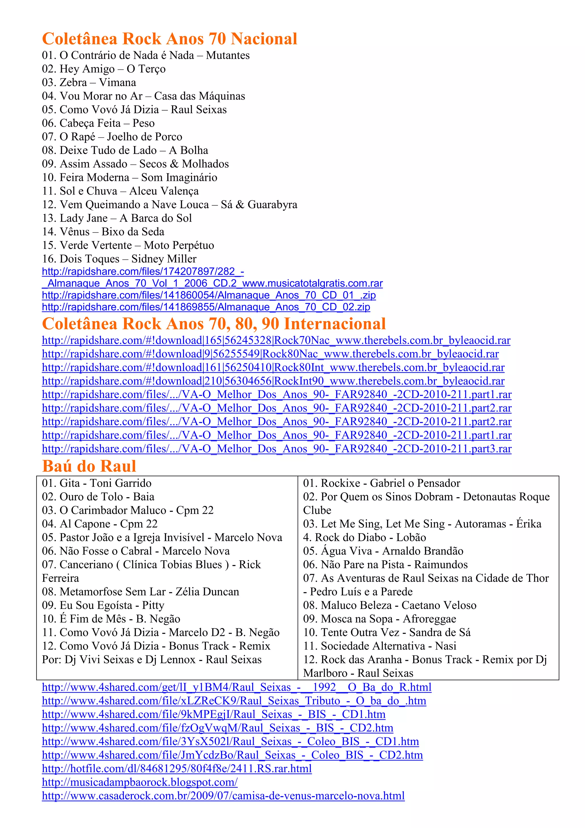 O documento lista coletâneas de rock nacional e internacional dos anos 70, 80 e 90, incluindo artistas como Raul Seixas, Mutantes, Secos & Molhados, e fornece links para download dos álbuns. Ele também lista um álbum tributo a Raul Seixas com versões de suas músicas por outros artistas.