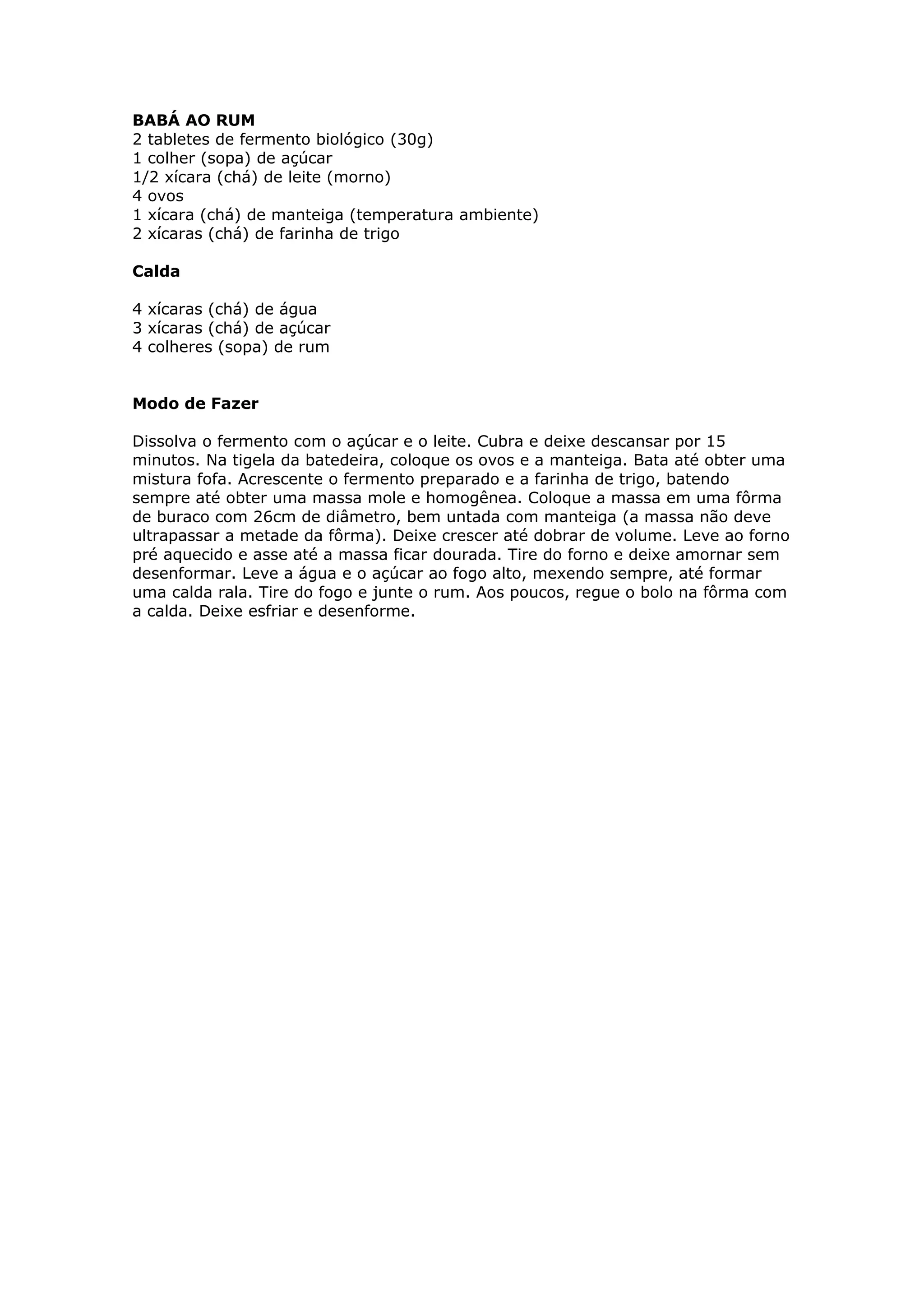 Este documento fornece a receita de um bolo de rum com as seguintes etapas: preparar a massa com fermento, ovos e manteiga e deixar crescer; assar o bolo até dourar; preparar uma calda de água, açúcar e rum e regar o bolo assado nela.