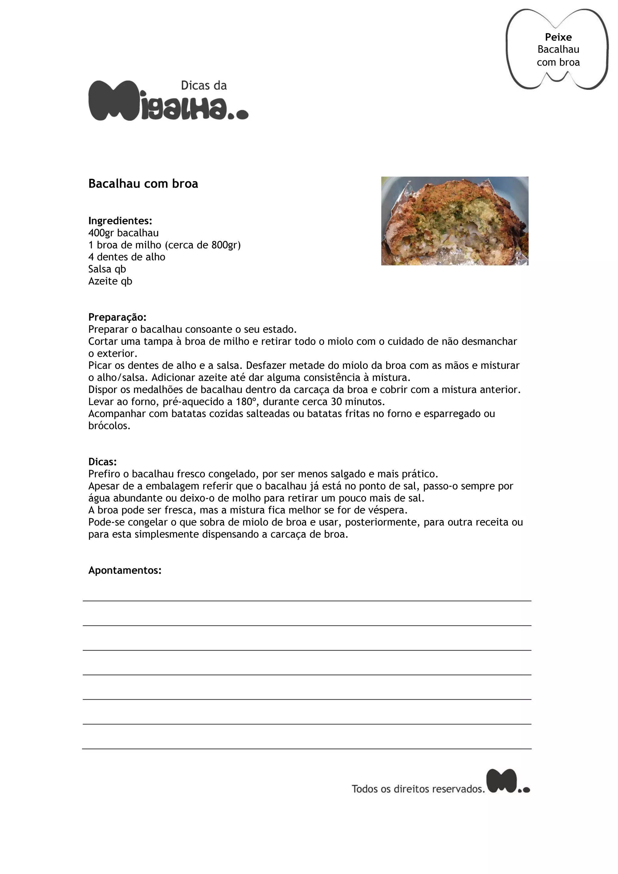 Este prato português tradicional consiste em medalhões de bacalhau cobertos com uma mistura de alho, salsa e miolo de broa dentro da carcaça de uma broa de milho, assados no forno. As etapas incluem preparar o bacalhau, retirar o miolo da broa e misturá-lo com alho e salsa, colocar o bacalhau dentro da broa e levar ao forno.