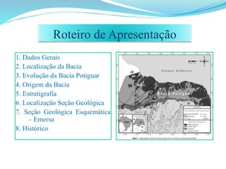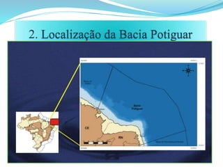 A Bacia Potiguar situa-se no nordeste do Brasil, abrangendo parte dos estados do Rio Grande do Norte e Ceará. Sua origem está ligada à formação do Atlântico Sul durante o rifteamento do supercontinente Gondwana no Neojurássico. A bacia contém importantes campos de petróleo em reservatórios arenosos das formações Açu, Guamaré e Tibau.
