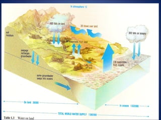 O documento discute conceitos fundamentais de hidrologia, incluindo o ciclo hidrológico, balanço hídrico, escoamento superficial, medidas de débito fluvial e fatores que influenciam a infiltração e escoamento da água.