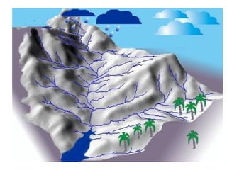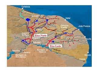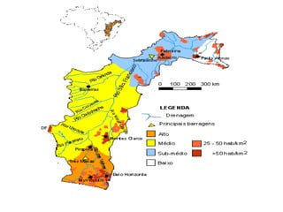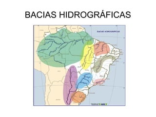 O documento descreve as principais bacias hidrográficas do Brasil, incluindo a Bacia Amazônica, a maior do mundo; a Bacia do São Francisco, que atravessa o semiárido nordestino; e a Bacia Platina, formada pelas bacias do Paraná, Paraguai e Uruguai, com grande potencial hidrelétrico.