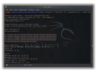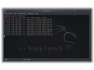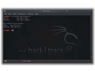 O documento apresenta uma introdução ao uso da ferramenta Backtrack para testes de penetração, destacando suas funcionalidades e etapas da metodologia. Aborda as fases de obtenção de informações, detecção de sistemas ativos, varreduras e exploração de vulnerabilidades, incluindo técnicas como engenharia social e força bruta. Conclui enfatizando a importância de práticas de segurança adequadas para proteger sistemas e usuários.