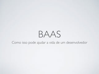O documento discute Backend as a Service (BAAS), que fornece uma maneira mais fácil para desenvolvedores configurarem, usarem e operarem um backend na nuvem para aplicativos móveis e web. BAAS oferece serviços como gerenciamento de usuários, armazenamento de dados e API personalizável por uma taxa mensal ou baseada em uso. O documento fornece exemplos de código de como usar esses serviços em diferentes linguagens de programação.