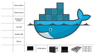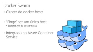 O documento discute o uso de contêineres no Azure utilizando o Docker e o Azure Container Service. Apresenta as vantagens dos contêineres sobre máquinas virtuais e demonstra a criação de um cluster no Azure Container Service usando Docker Swarm e DCOS para orquestrar contêineres. Explica a arquitetura em camadas do Azure Container Service.