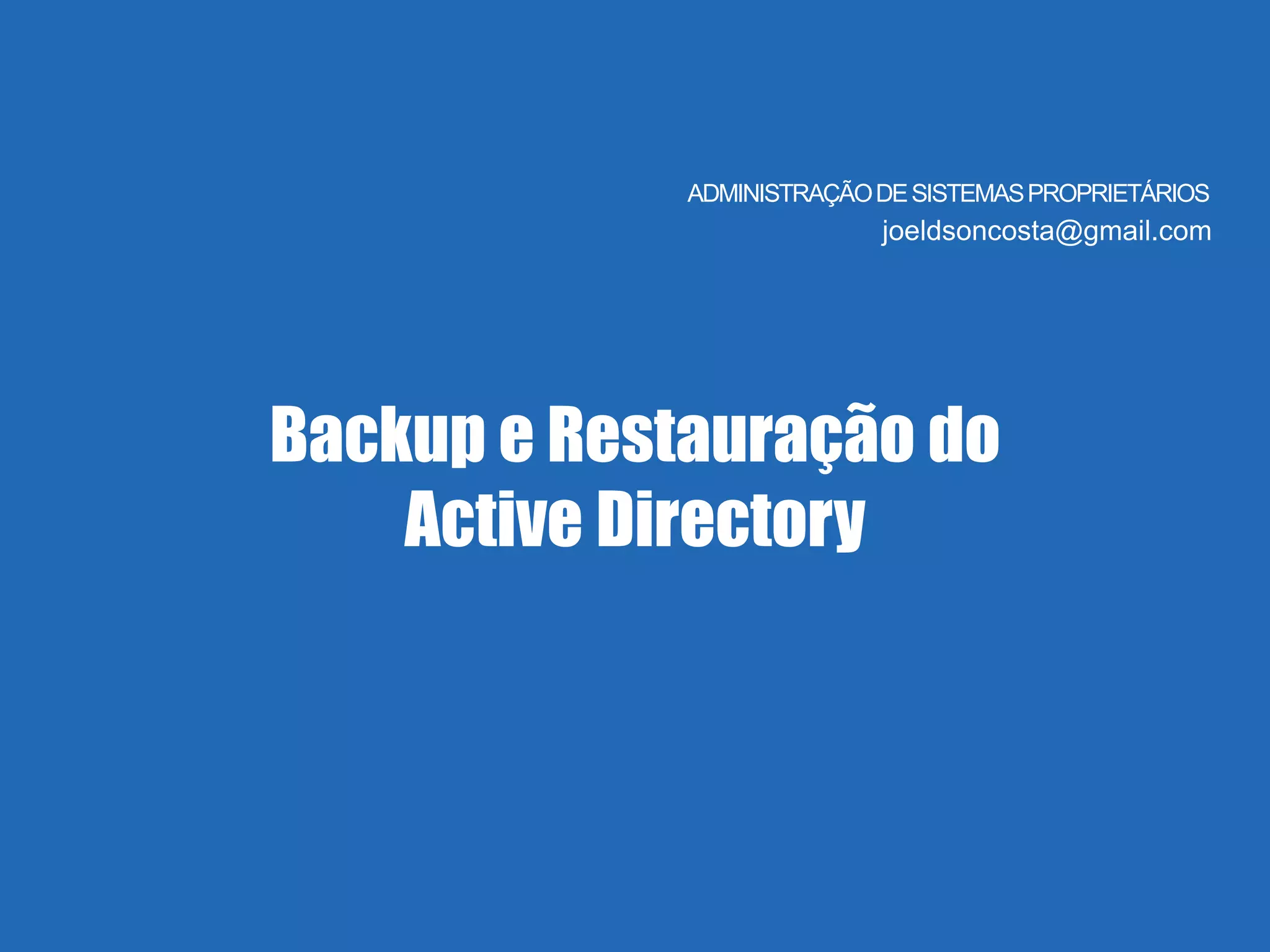 O documento discute backup e restauração do Active Directory (AD). Ele explica que o backup do AD não é só do diretório de serviços, mas também inclui registro do sistema, DNS e outras configurações. O documento fornece instruções passo a passo sobre como fazer backup e restauração do estado do sistema usando ferramentas do Windows Server para proteger e recuperar o AD em caso de falha.
