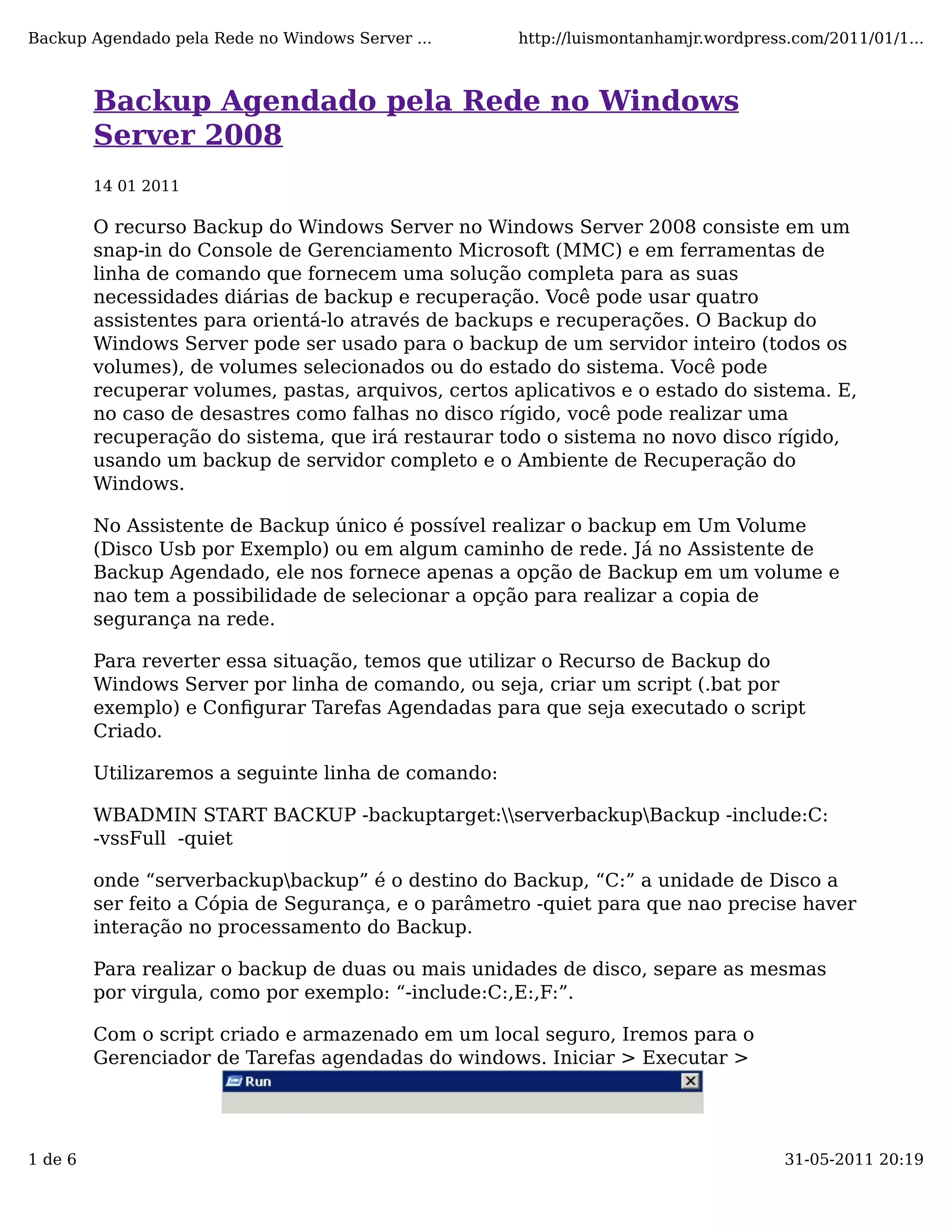 O documento descreve como configurar backups agendados na rede no Windows Server 2008 usando linhas de comando. Ele explica como criar um script de backup para copiar arquivos e pastas para uma pasta de rede e configurar tarefas agendadas para executar o script em uma frequência definida, permitindo backups automáticos na rede.