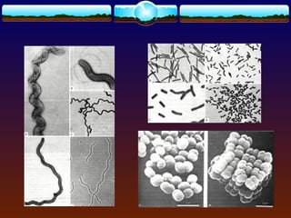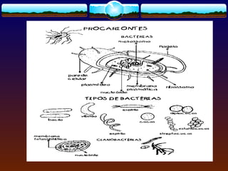 O documento discute as características gerais, estrutura, metabolismo, reprodução, importância e doenças causadas por bactérias e cianobactérias. As bactérias são os seres vivos mais antigos e simples da Terra e desempenham papéis importantes como decompositoras, na fixação de nitrogênio e na produção de alimentos e antibióticos. Cianobactérias realizam fotossíntese e também fixam nitrogênio, fertilizando o solo.