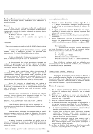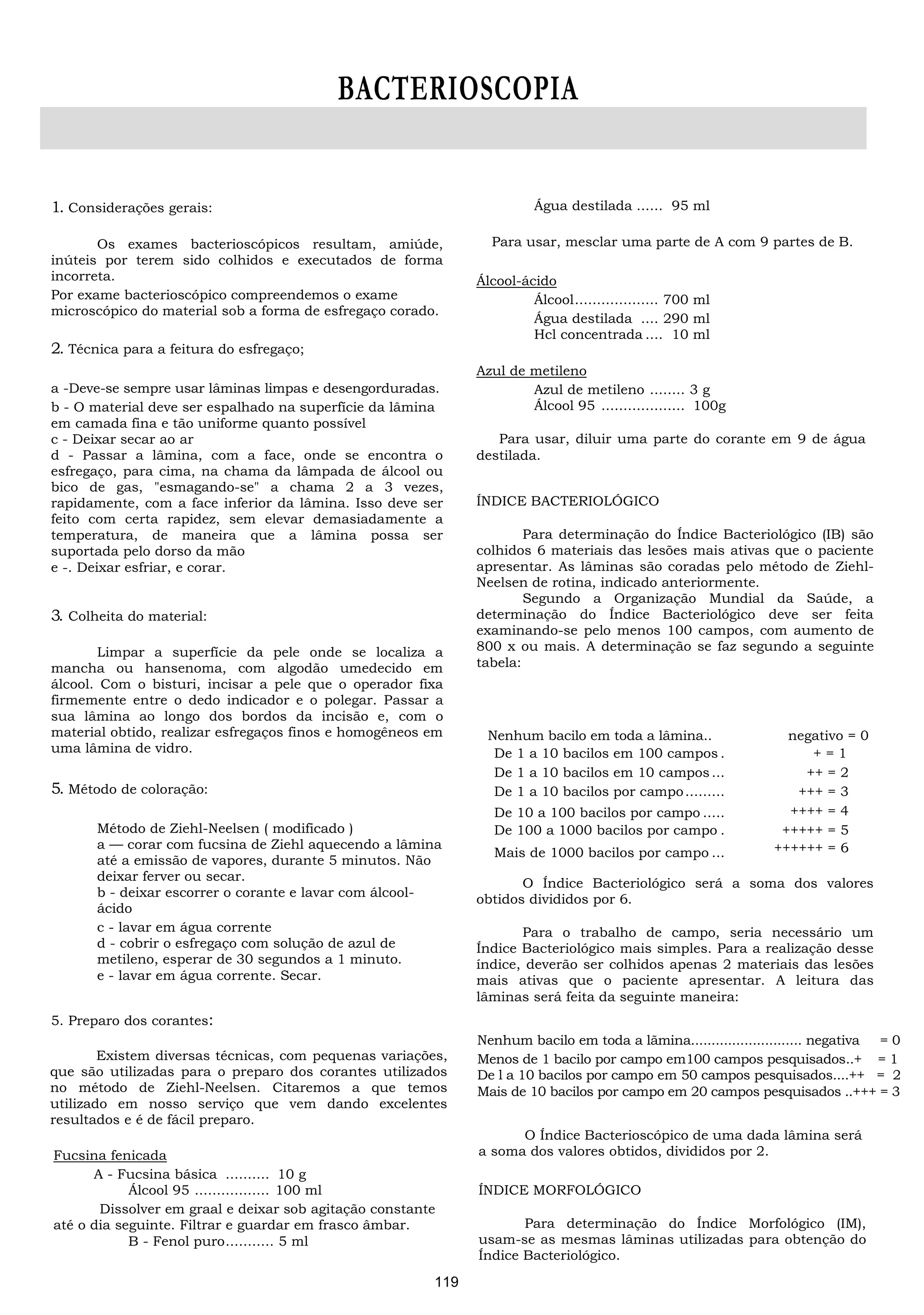 O documento fornece instruções detalhadas sobre técnicas para realizar exames bacterioscópicos para hanseníase, incluindo a preparação de esfregaços, coloração, contagem de bacilos, e cálculo de índices bacteriológicos e morfológicos. Também descreve a preparação do antígeno de Mitsuda utilizado para testes de diagnóstico.