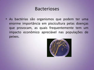 As bactérias podem causar doenças graves em peixes de cultivo, como a furunculose causada pela bactéria Aeromonas salmonicida e a doença branquial bacteriana causada por Flavobacterium branchiophilum. Estas doenças podem ter altas taxas de mortalidade e são difíceis de tratar, sendo necessário identificar corretamente o agente causador e aplicar antibióticos de forma adequada para controlar surtos e minimizar perdas econômicas.