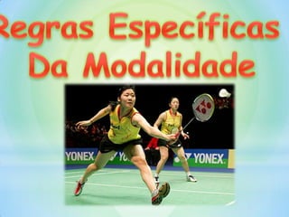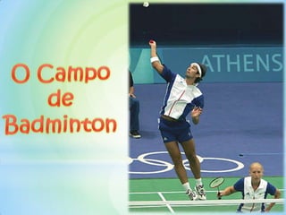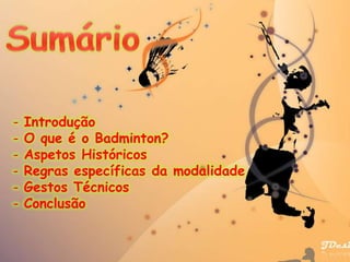 Este documento resume o jogo de badminton, incluindo sua definição, história, regras, equipamentos e técnicas. O badminton surgiu na Grécia antiga e se espalhou para a Ásia, chegando à Inglaterra no século XIX. As partidas são disputadas em três sets até 21 pontos, com o objetivo de lançar o volante para o lado do adversário sem tocá-lo. As raquetes pesam entre 85-110 gramas e a rede fica a 1,55 metros do chão.