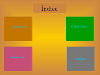 Este documento fornece um resumo sobre as regras e história do badminton. Explica que o badminton é um dos esportes mais antigos e praticados no mundo, tendo aparecido nos Jogos Olímpicos em 1972. Detalha as principais regras como a posição dos jogadores, como marcar pontos, o que constitui falta e como termina um jogo.