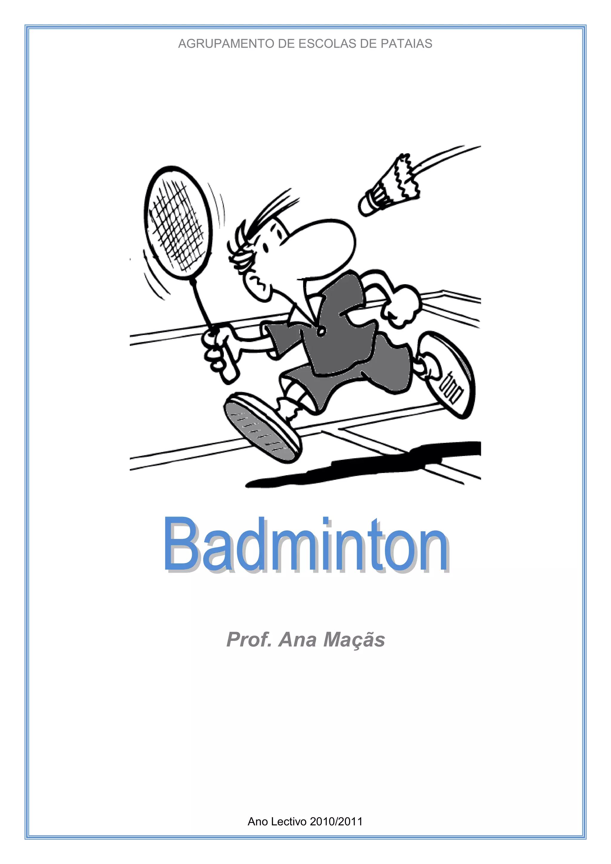 Este documento fornece um resumo das regras e história do badminton. O badminton provavelmente teve origem na Índia e se espalhou para a Grã-Bretanha e outros países. As regras oficiais estabelecem as dimensões do campo e da rede, especificações para raquetes e volantes, e regras para pontuação e serviço.