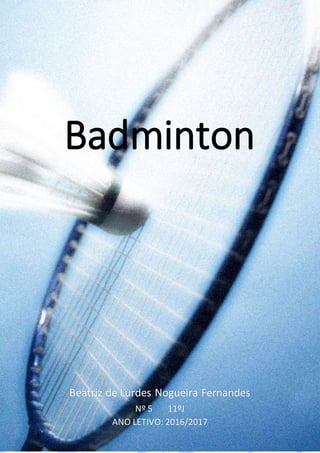 O documento descreve a história e as regras básicas do badminton. Começou como um jogo britânico no século XIX e evoluiu até se tornar um esporte olímpico. O campo de badminton mede 13,40m x 6,10m e é dividido ao meio por uma rede a 1,55m do chão.
