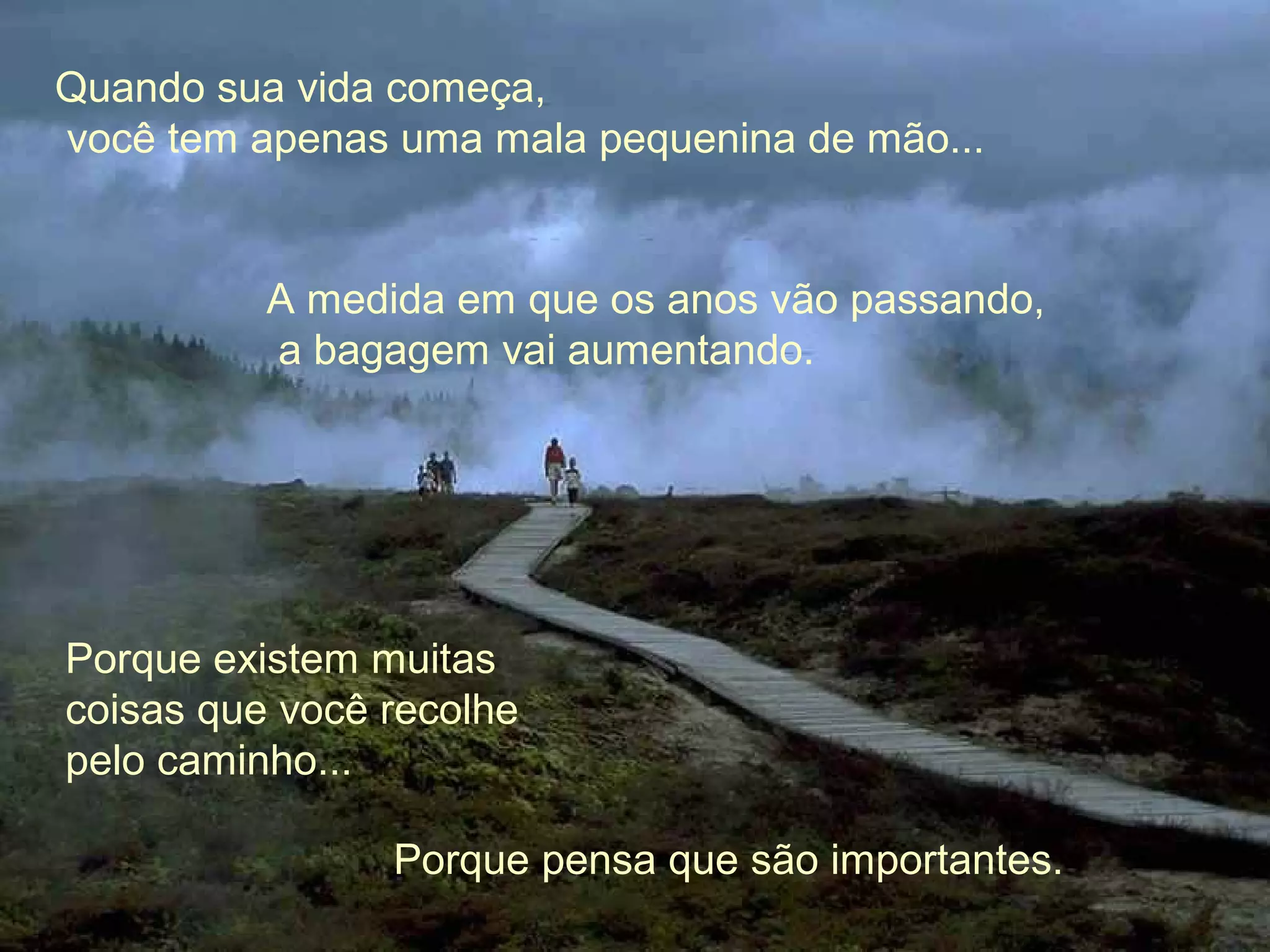 O documento fala sobre a bagagem que carregamos ao longo da vida. No começo temos apenas uma pequena mala, mas com o tempo ela vai ficando maior à medida que acumulamos coisas. Chega um ponto em que fica pesado demais. Precisamos esvaziar a mala, analisar o que temos dentro e tirar o que nos pesa, como raiva e desânimo, ficando apenas com sentimentos positivos como amor, amizade e felicidade.