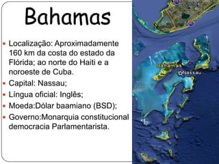 As Bahamas são um arquipélago localizado no Oceano Atlântico a nordeste de Cuba. Sua capital é Nassau e sua população é majoritariamente de origem africana. A economia das Bahamas depende principalmente do turismo devido às suas belas praias e águas cristalinas, além da pesca e dos serviços financeiros.